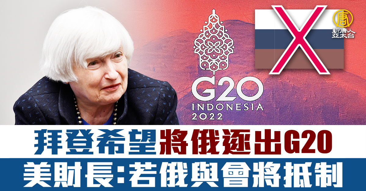 【新唐人亞太台 2022 年 04 月 07 日訊】美國財政部長葉倫(Janet Yellen)今天表示,總統拜登希望將俄羅斯逐出20國集團(G20),若俄國官員出席在印尼舉行的G20會議,美國將抵制其中一些會議。