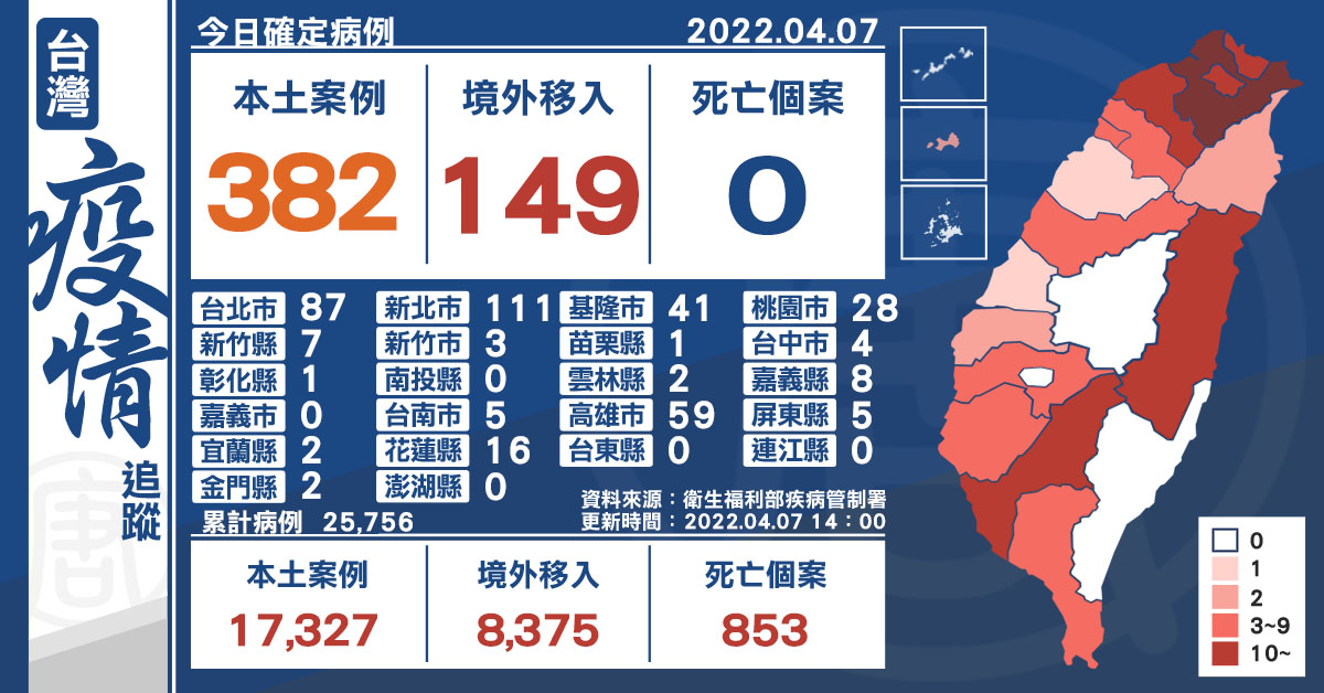 今日新增之382例本土病例,為188例男性、194例女性,年齡介於未滿5歲至80多歲,發病日介於今(2022)年3月29日至4月7日,其中包含165例為無症狀感染。個案分佈為新北市(111例)、臺北市(87例)、高雄市(59例)、基隆市(41例)、桃園市(28例)、花蓮縣(16例)、嘉義縣(8例)、新竹縣(7例)、臺南市及屏東縣(各5例)、臺中市(4例)、新竹市(3例)、金門縣、宜蘭縣及雲林縣(各2例)、苗栗縣及彰化縣(各1例)。相關疫情調查持續進行中。