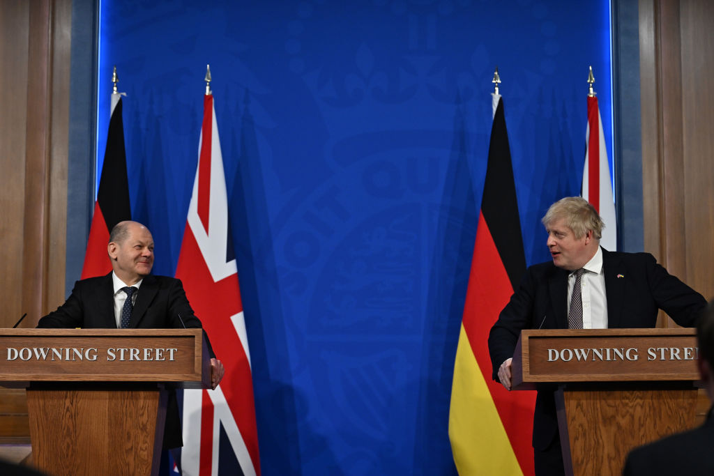 德國總理蕭茲(左)上任後首度與英國進行雙邊擴大會談,會後與強生(右)共同舉行記者會。(圖/GettyImages)