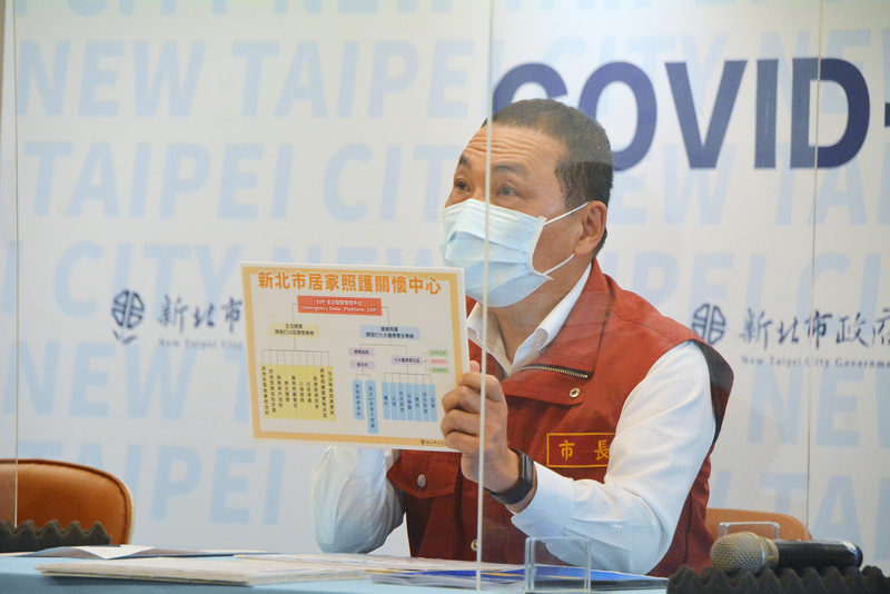 新北市長侯友宜9日在記者會中表示,從清零至與病毒共存的過渡期,調整步伐的配套措施速度一定要快,新北已做最壞的打算、最好的準備,讓居家照護成為病患選項之一,絕對不能等到醫療量能被衝垮才做。(圖/中央社)