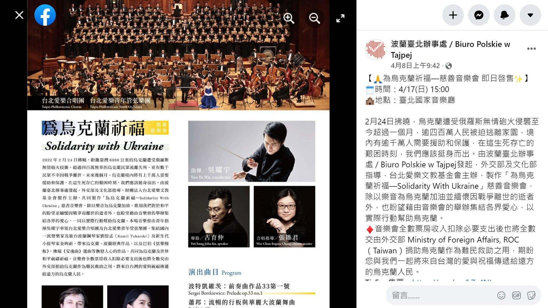 波蘭駐台代表處9日在官方臉書發文指出,這場「為烏克蘭祈福—Solidarity With Ukraine」慈善音樂會即日起開始售票,音樂會由外交部與文化部指導,台北愛樂文教基金會主辦。