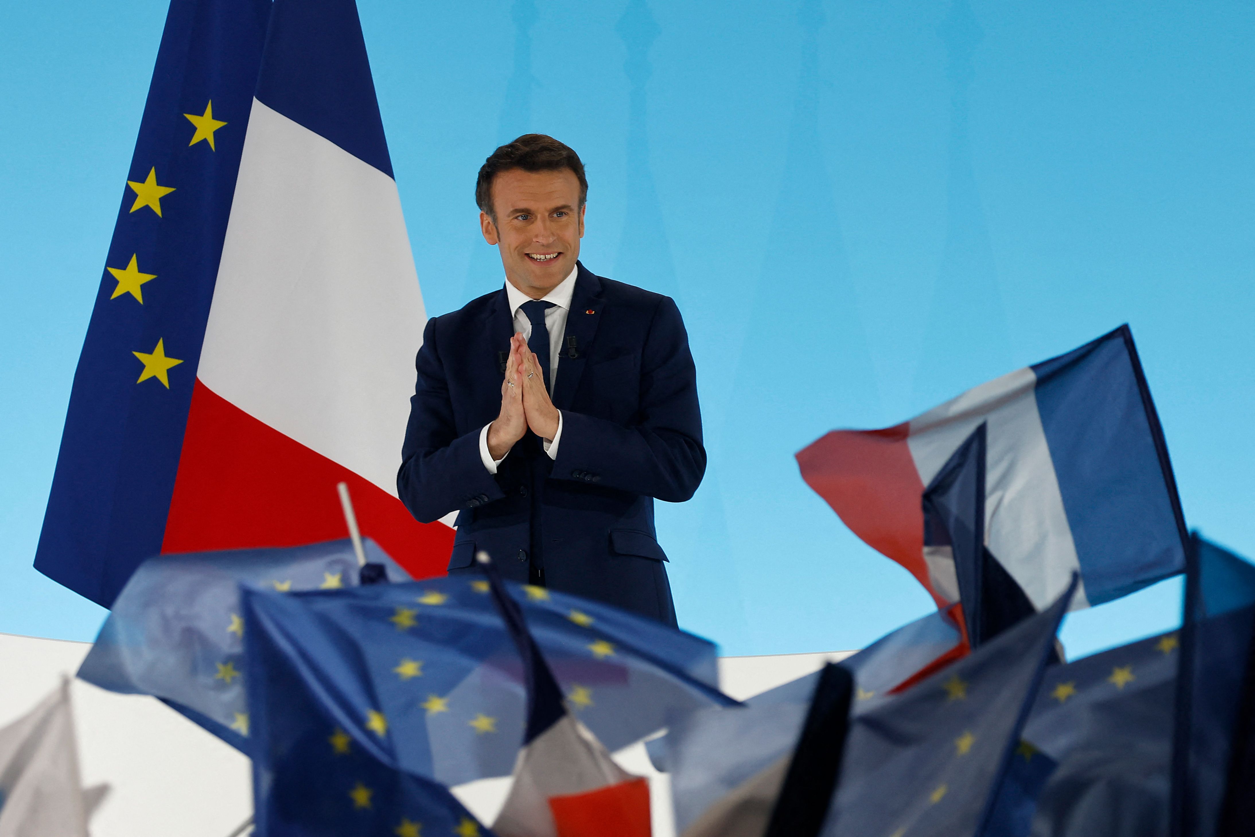 法國現任總統馬克宏在大選首輪投票的得票數領先,民調看好他能在第2輪投票後順利連任,但他絲毫不敢大意,頻要支持者再為他拉票。(圖/GettyImages)