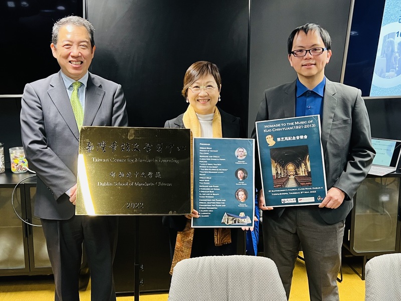 4月12日是「台灣現代民族音樂之父」作曲家郭芝苑逝世紀念日,駐愛爾蘭代表楊子葆(左一)與正在訪問愛爾蘭的僑委會副委員長徐佳青(中)宣布,5月5日晚間將在都柏林舉行郭芝苑紀念音樂會,這是首次有台灣作曲家的作品在愛爾蘭公開演出。(圖/駐愛爾蘭台北代表處提供)