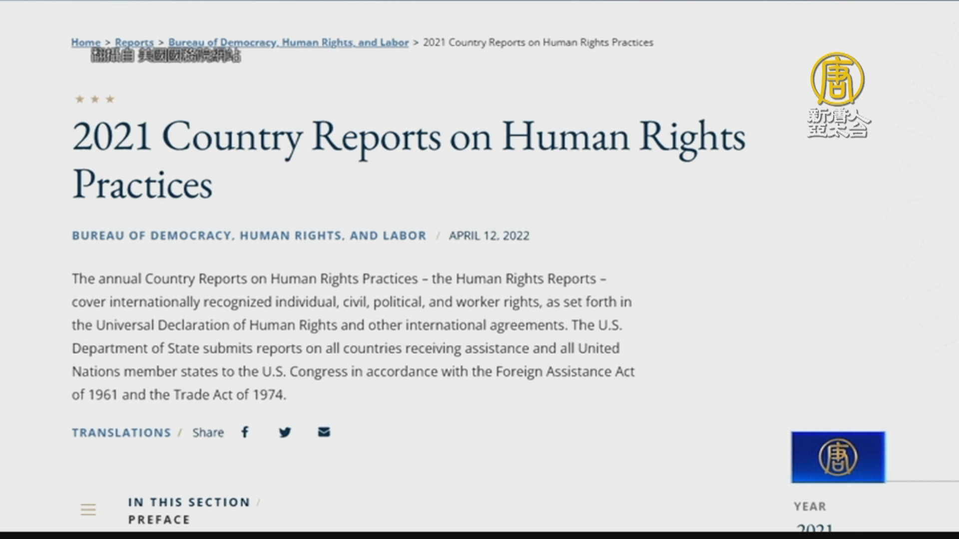 【新唐人亞太台 2022 年 04 月 13 日訊】美國國務院12日公布最新人權報告,點名中共、俄羅斯、北韓等9國,持續侵害人權和民主。報告指出,2021年,中國發生了針對維吾爾人和新疆其它少數民族,以及針對宗教信仰群體法輪功學員、基督徒的人權迫害。美國國務卿布林肯表示,中共持續犯下種族滅絕和反人類罪。