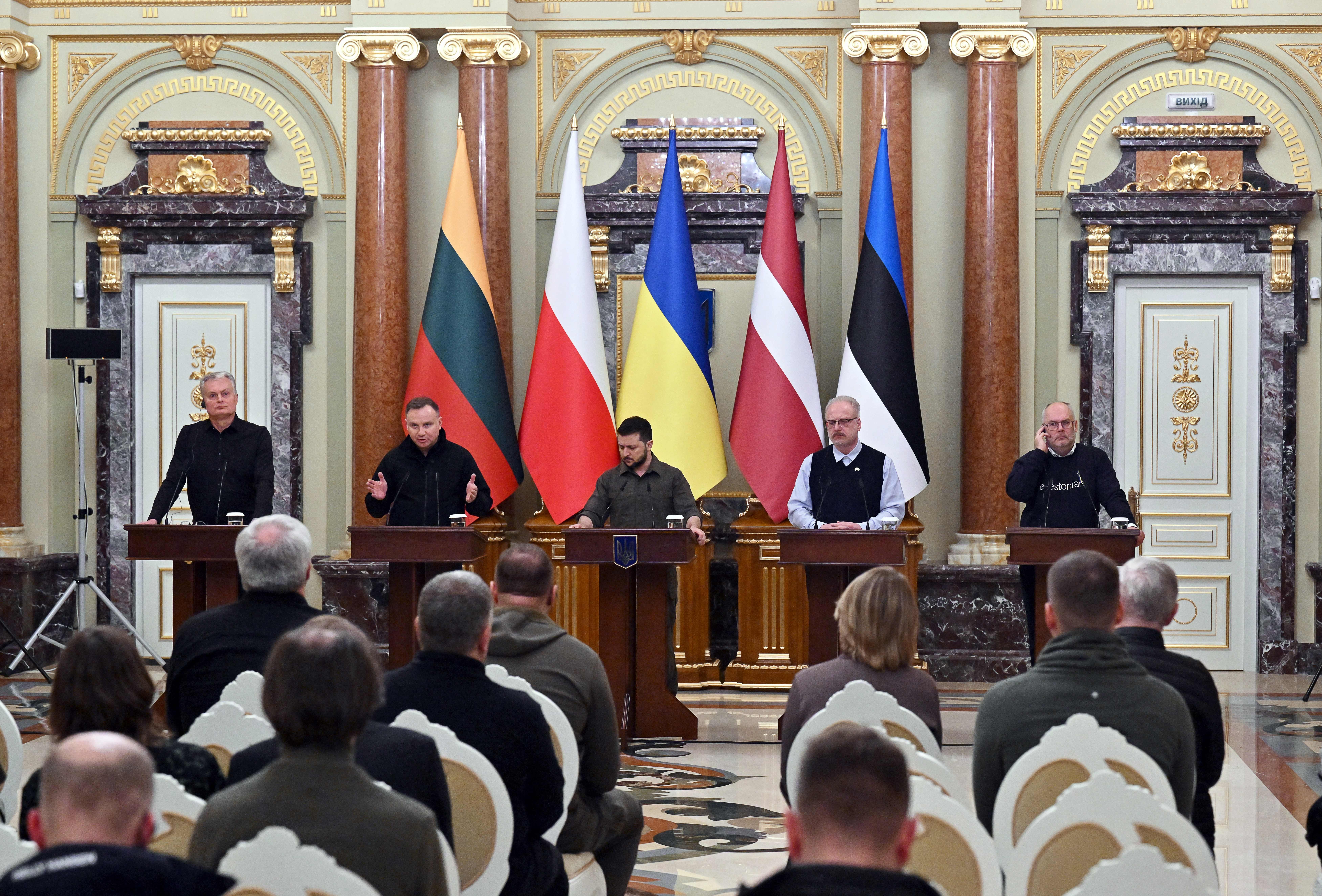 波蘭、立陶宛、拉脫維亞和愛沙尼亞4國總統13日在基輔與烏克蘭總統澤倫斯基見面。圖左至右依序為立陶宛總統瑙塞達、波蘭總統杜達、烏克蘭總統澤倫斯基、拉脫維亞總統李維茲、愛沙尼亞總統卡里斯。(圖/GettyImages)