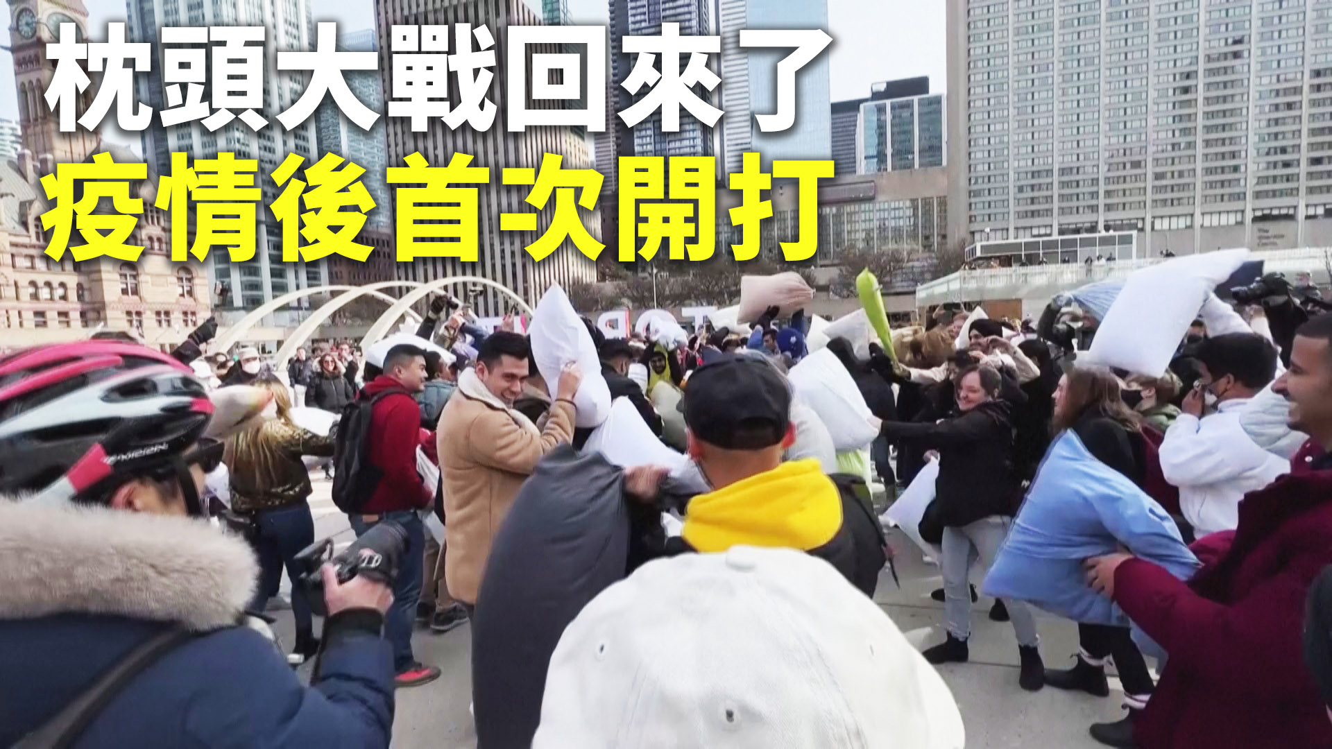 5、4、3、2、1,2022年多倫多枕頭大戰回來了!4月2日在加拿大多倫多市政廳前的廣場上,不論大人或小朋友,齊聚一起參與這場疫情後的首次枕頭大戰。