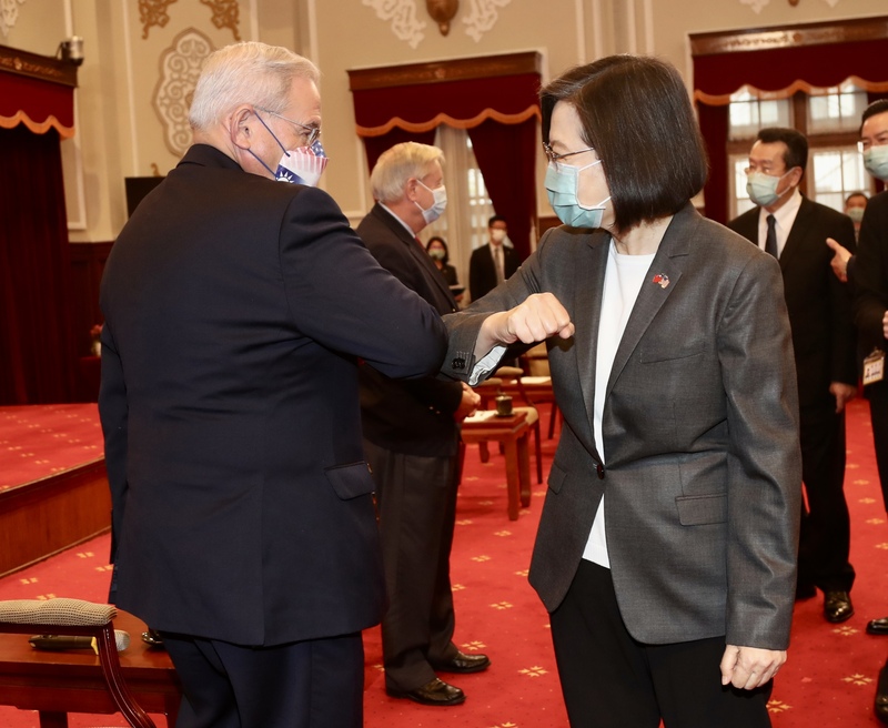 總統蔡英文(前右)15日在總統府接見「美國聯邦參議員葛瑞姆率領重量級聯邦參眾議員訪團」,與美國參議院外交委員會主席梅南德茲(Robert Menendez) (前左)碰肘致意。(圖/中央社)