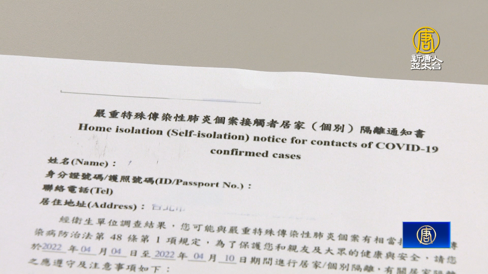 【新唐人亞太台 2022 年 04 月 20 日訊】疫情燒進校園,不少家長因為得照顧被匡列隔離的小孩,或是自己被匡列,小孩沒人照顧,沒上班,沒支薪的情況,讓家長傷透腦筋,但是其實只要憑著「居家隔離通知書」,是可以向政府申請1天1千元的防疫補償金,最多能領1萬元,衛福部說明,除了要有「隔離通知書」外,實際領取日數必須扣除雇主支領薪資日數,也就是工作單位「不給薪」才可請領。
