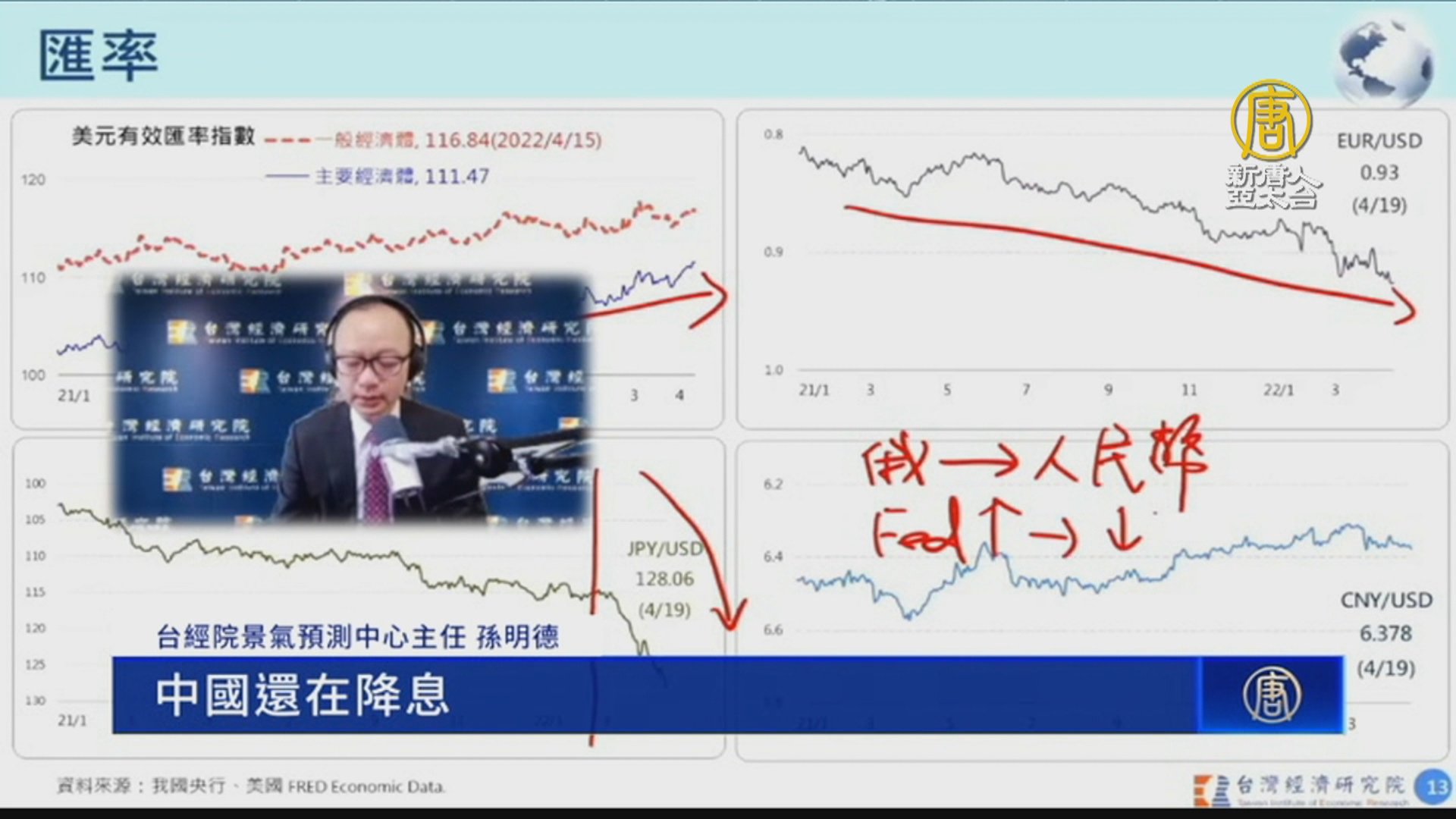 台經院景氣預測中心主任 孫明德:「人民幣在前一陣子沒有貶,這個禮拜開始貶,為什麼呢?第一個,人民幣之前沒有貶的原因是因為,俄烏衝突之間,俄羅斯因為外匯存底被凍結了,所以俄國很多人都把自己的資產轉換成人民幣。現在盧布已經沒有在貶,俄國的那些有錢人不急著要把錢給換出來,現在換匯動機不如以前高。再加上,美國聯準會在升息,然後中國的央行在降,美國聯準會要升息,中國還在降息。所以造成人民幣現在開始才要弱勢,它比別的亞洲貨幣慢了一點,但是也還是走弱的。」