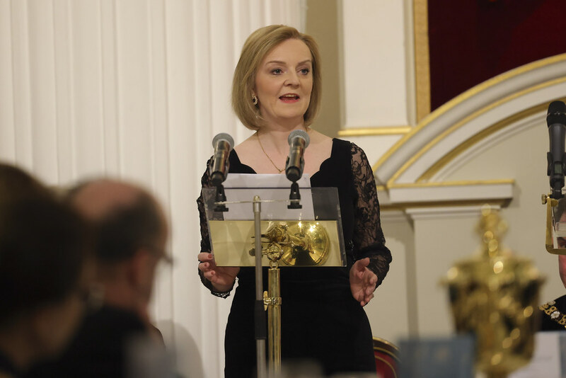 特拉斯(Liz Truss)27日晚間在倫敦金融城市長官邸(Mansion House)晚宴發表約20分鐘外交政策演說,現場有各國大使和政府官員。