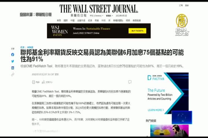 【新唐人亞太台 2022 年 05 月 03 日訊】美國聯準會周三公佈貨幣政策,投資人正在為聯準會2000年以來最大的升息做準備,周一美國公債賣壓加劇,10年期公債殖利率隨債券價格下跌而上漲,創下三年來首度升破3%的新里程碑。外媒引述,聯邦基金利率期貨的交易員分析,Fed周三升息50個基點(0.5%)的可能性,幾乎為100%,認為還有可能出現一次更大規模的升息,6月份升息75個基點(0.75%)的可能性為91%,高於一個月前的19%。