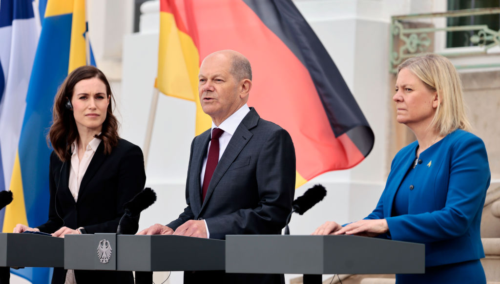 德國總理蕭茲(中)和瑞典總理安德森(右)、芬蘭總理馬林(左)召開記者會,蕭茲表示,沒有人能假設俄國不會攻擊其他國家,如果芬蘭和瑞典決定加入北大西洋公約組織,德國將予以支持。(圖/GettyImages)