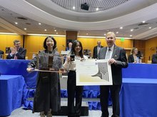 巴黎發明展主席多瑞頒發甘蔗渣餐具發明金牌,由徐捷中(右)、賴作松(左2)代領。駐法國代表吳志中(左)獲邀擔任座上嘉賓。(圖/中央社)