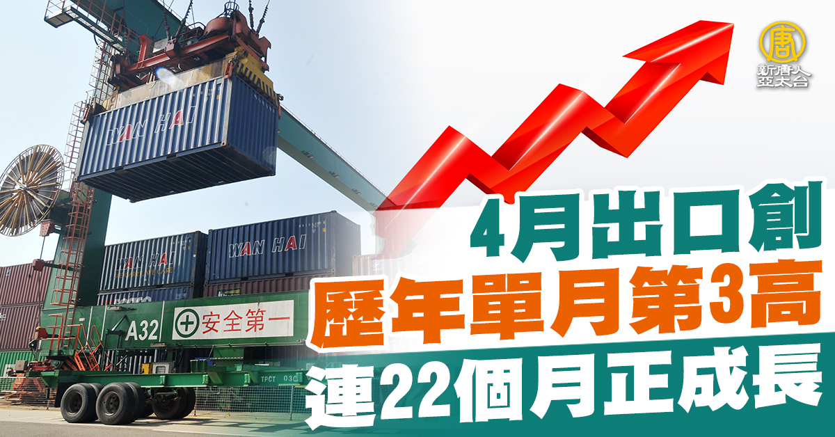 4月出口創歷年單月第3高 連22個月正成長