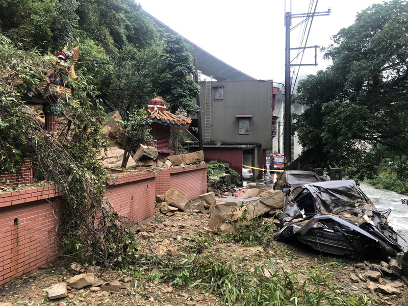 新北市政府消防局下午3時許獲報,石碇區石碇西街上的土地公廟後方土石滑落,崩塌面積約長度15公尺、寬25公尺、高度20公尺,約6到7層樓高,幸無人受傷,警方到場進行交通管制,並拉起封鎖線。