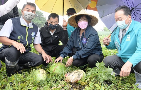 【新唐人亞太台 2022 年 05 月 16 日訊】彰化縣全縣西瓜栽培面積約有257公頃,今年3月下旬大雨導致西瓜著果率不佳,果實長大更有畸形或是裂果情形。彰化縣長王惠美與民代今天(16日)前往福興鄉西瓜農田勘災,表示,縣府在第一時間獲報後,由縣府農業處馬上向中央農業主管機關陳報,為農友爭取257公頃全數列為災害補償區域。