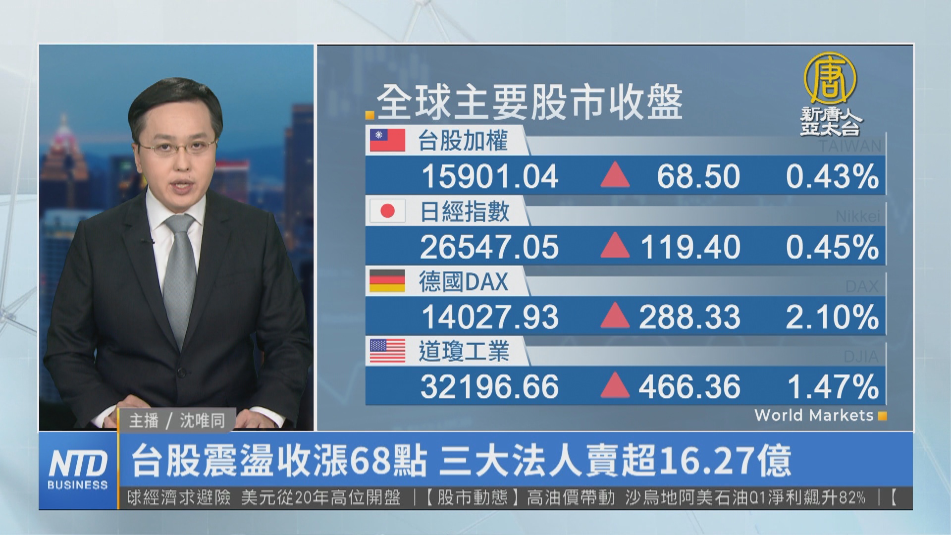【新唐人亞太台 2022 年 05 月 16 日訊】新聞一開始,先來關心股市。上週五,美國股市大漲,Nasdaq及費城半導體指數表現亮眼,激勵台積電股價表現,週一是一度上漲13元,加上股王矽力-KY登上漲停,台股加權指數,一度重回1萬6000點,不過美股盤前期貨指數翻黑,加上金融、航運類股賣壓湧現,加權指數漲幅收斂,收在 1萬5901點,總計三大法人合計賣超16.27億。另外,由於俄烏戰爭糧食問題,加上中國封城等因素,景氣利空尚未探底,這波台股震盪明顯,財政部長蘇建榮上午強調,台股基本面穩健,國安基金會持續密切關注政經情勢發展。
