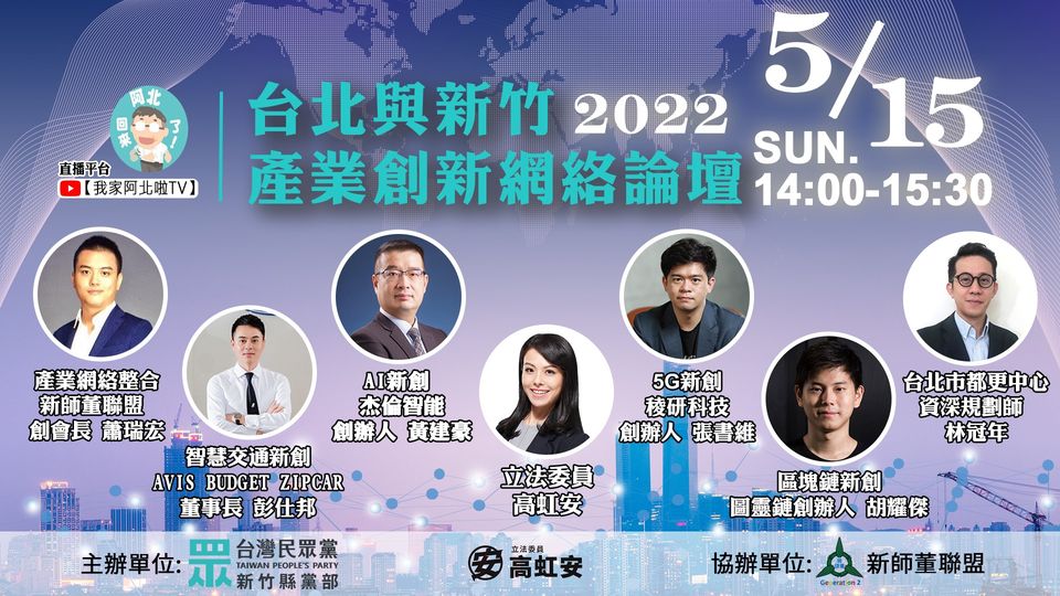 論壇由台北市都更中心資深規劃師林冠年主持,台灣民眾黨立法委員高虹安則透過視訊與新師董聯盟創會長蕭瑞宏、稜研科技創辦人張書維、智慧交通新創AVIS Budget Zipcar董事長彭仕邦、杰倫智能創辦人黃健豪、圖靈鏈創辦人胡耀傑等五位創業青年共同座談。期待增進新創公司量能,也能幫助傳統產業數位升級。