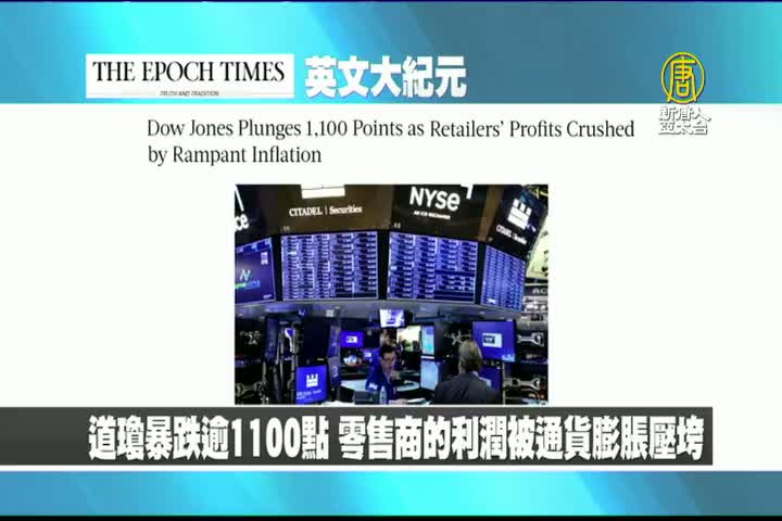 【新唐人亞太台 2022 年 05 月 19 日訊】首先來看到美國大紀元英文版報導:道瓊暴跌超過1100點,零售商的利潤被通貨膨脹壓垮。