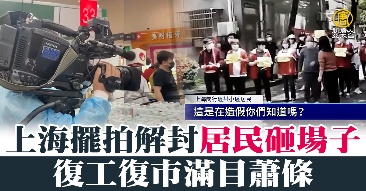 上海某超市的「擺拍」現場,某電視台的攝影機正在拍攝收款台前「等待」付款的群眾,而網友們同時拍到的影片中,卻顯示商場內所有其他店鋪都大門緊閉,官方的「復工復產」被狠狠打臉。