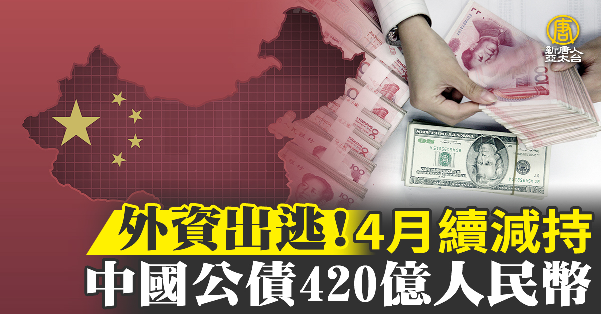【新唐人亞太台 2022 年 05 月 19 日訊】中國3月創紀錄的資金外流,外媒報導,根據中債登17日公布最新數據顯示,外國投資者4月份拋售了420億元人民幣(62億美元)的中國國債,是連續第3個月遭外資減持。外媒引述分析指出,由於人民幣走弱預期、中美利差倒掛、貨幣政策持續分化以及中國經濟前景走弱,市場普遍預期中國債券將遭到進一步減持,預計資本外流將持續到第二季度。
