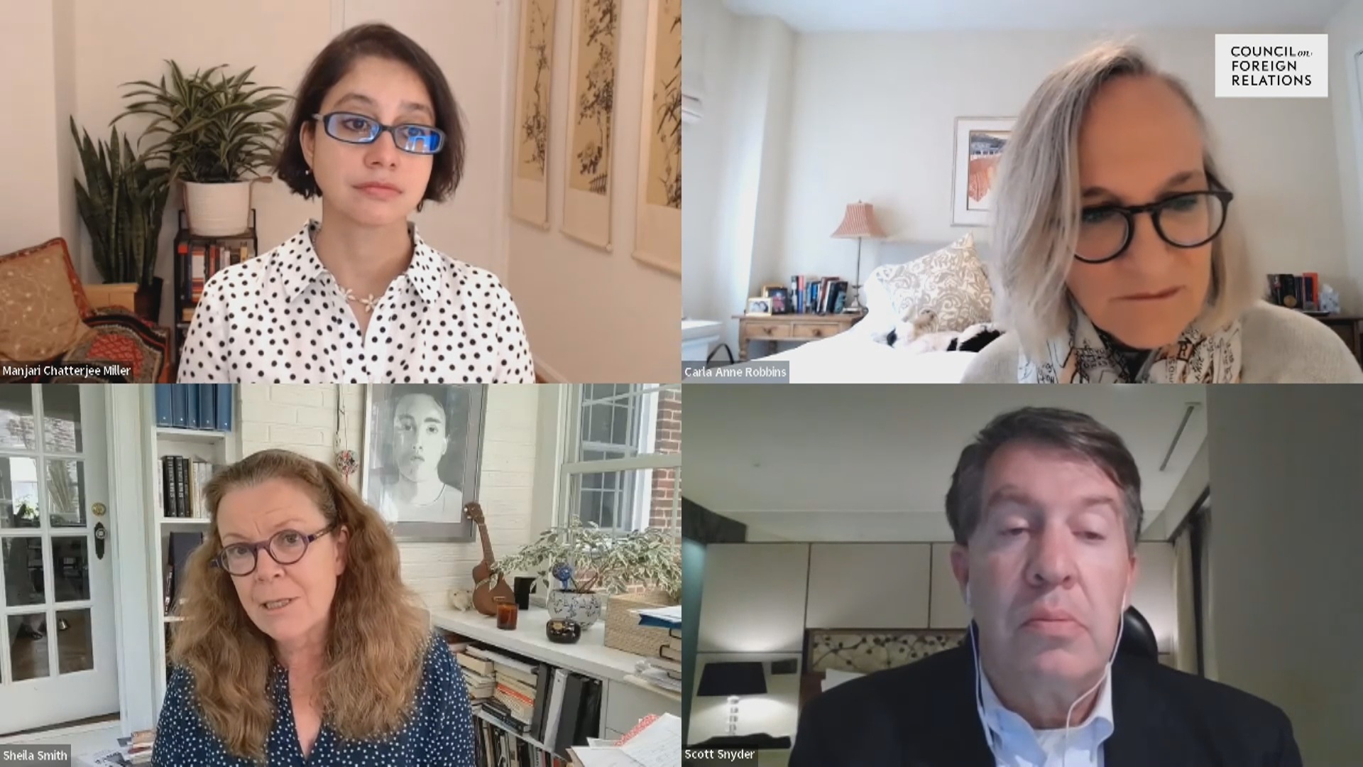 美國智庫外交關係協會亞太資深研究員史密斯(左下)19日說,美國總統拜登訪問日本期間,雙方可能開始嚴肅討論如何嚇阻北京對台進犯。(圖/翻攝自YT@Council on Foreign Relations)