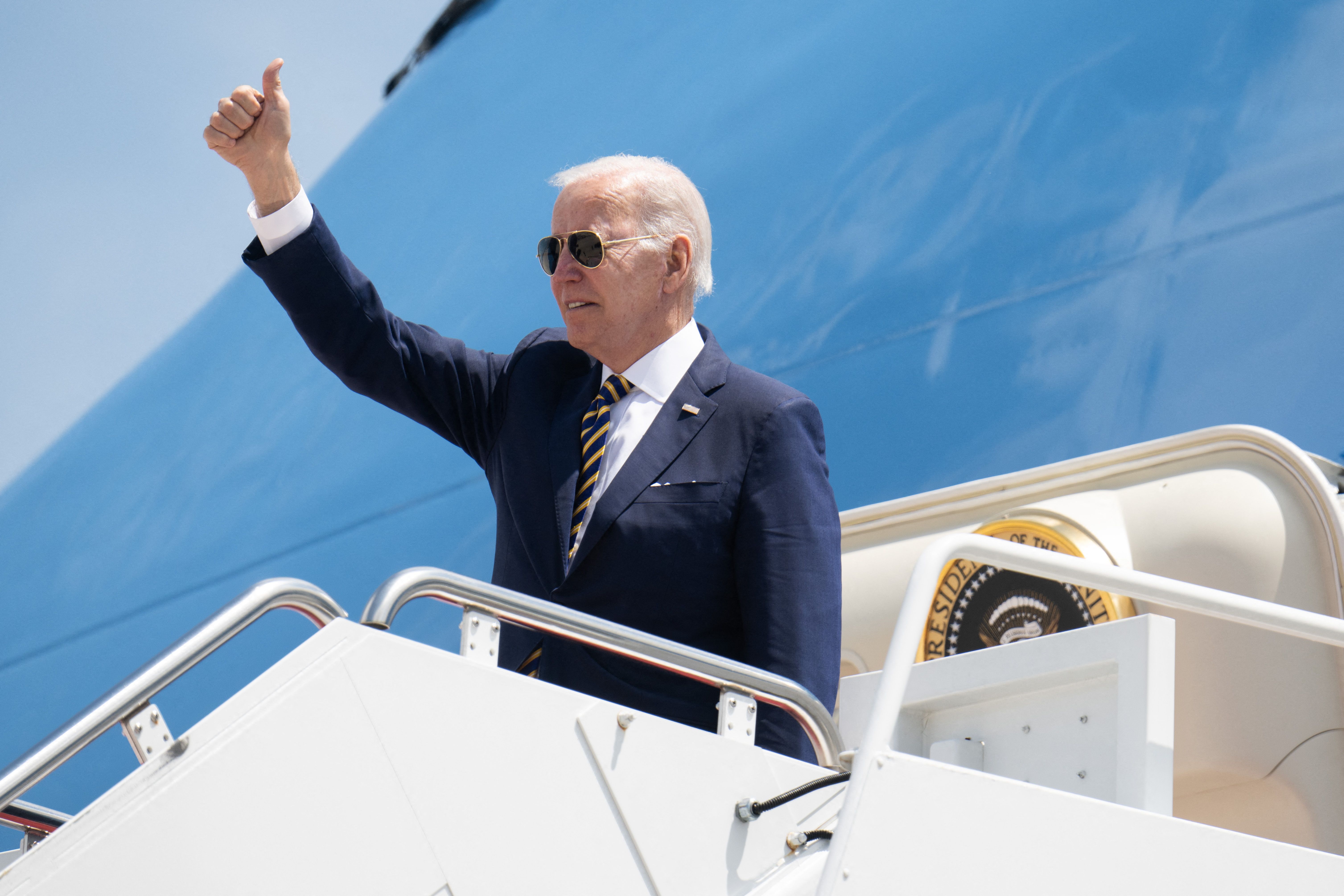 美國總統拜登上任後首度出訪亞洲,第一站在南韓料將受到領導階層熱烈歡迎,但可能面臨北韓領導人金正恩較不友善的招呼,例如可能試射洲際彈道飛彈甚至核試。圖為拜登自馬里蘭州安德魯聯合基地登上空軍一號,啟程飛往韓國。(圖/GettyImages)