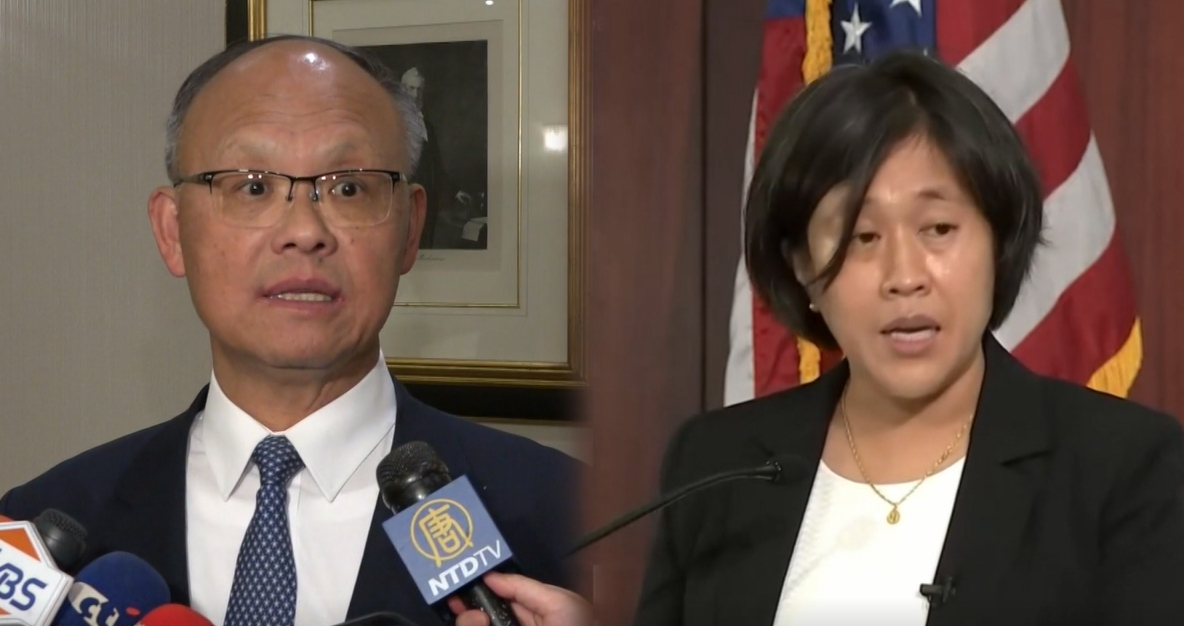 行政院政務委員鄧振中(圖左)說,美將宣布印太經濟架構沒有理由把台灣排除在外,「總是會找出方法容納台灣」不需太擔心。鄧振中20日在曼谷和美貿易代表戴琪(圖右)(Katherine Tai)舉行雙邊會談。資料照。(圖/新唐人資料影像)