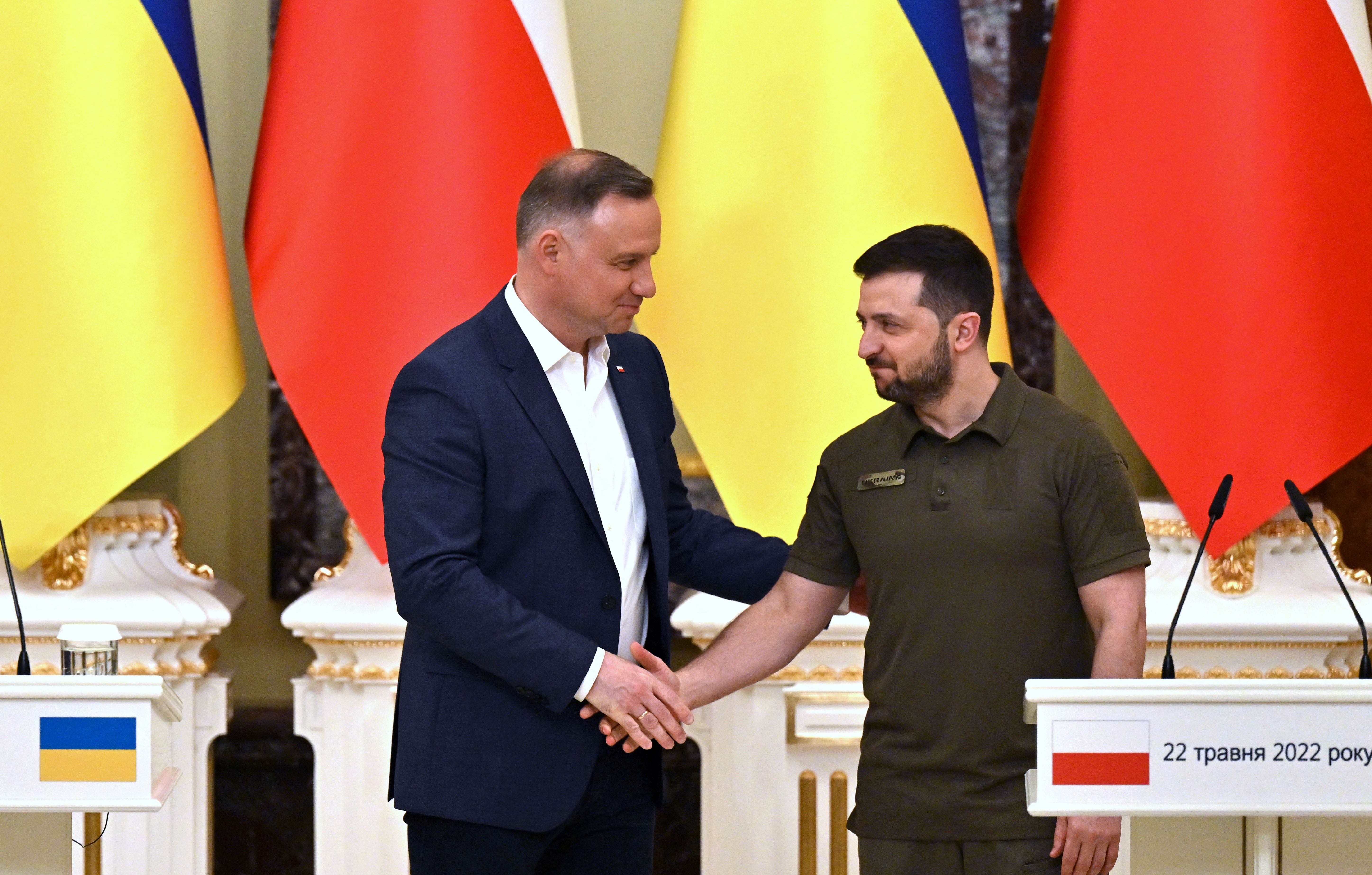 波蘭總統杜達(左)22日在與烏克蘭總統澤倫斯基(右)的聯合記者會上說,承諾全力支持烏克蘭加入歐盟,還說必須尊重那些為歐洲「流血」的人們。(圖/GettyImages)