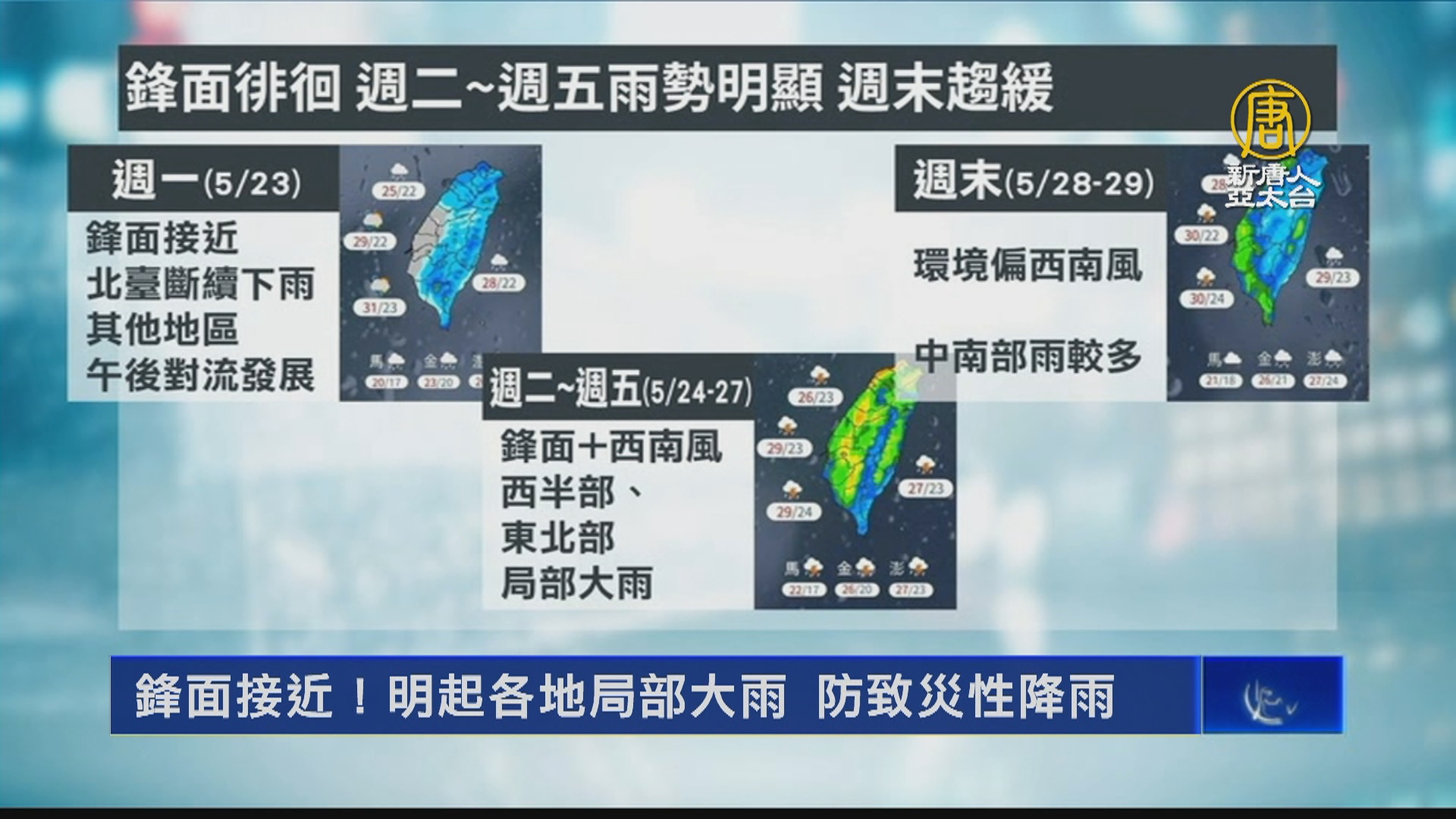 【新唐人亞太台 2022 年 05 月 23 日訊】歡迎回來。提醒民眾這週出門,要留意天氣了!因為梅雨滯留鋒面加上華南雨系等系統,相互作用,北台灣,從今天就會出現局部降雨。週二(5月24日)至週五(5月25日)各地都有局部陣雨或雷雨的機率,甚至可能發生致災性降雨,要到週末雨勢才會逐漸趨緩。