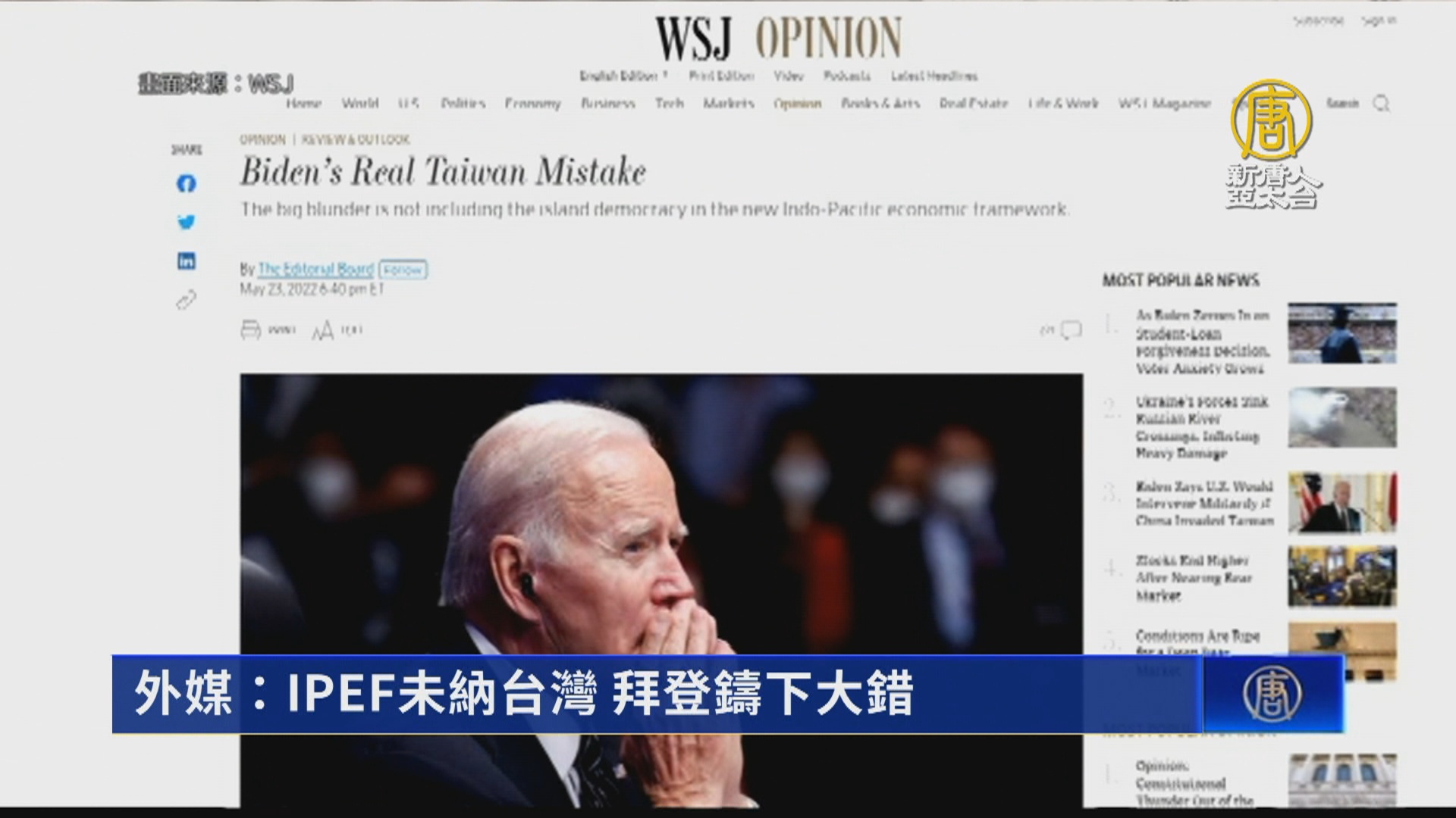 【新唐人亞太台 2022 年 05 月 24 日訊】美國總統拜登23日正式公布IPEF,由13個初始成員國組成,預計涵蓋全球約40%的GDP。外界認為,這個美國推動的全新貿易倡議是要抗衡中國在印太地區與日俱增的經濟影響力。華爾街日報社論表示,印太經濟架構(IPEF)未納入台灣,是拜登犯的大錯。文章提到,如果試圖展現美國對這地區投入甚深,將台灣排除在外根本就不合理,而且台灣是一個經濟強國,其參與將有助任何貿易或供應鏈協定。