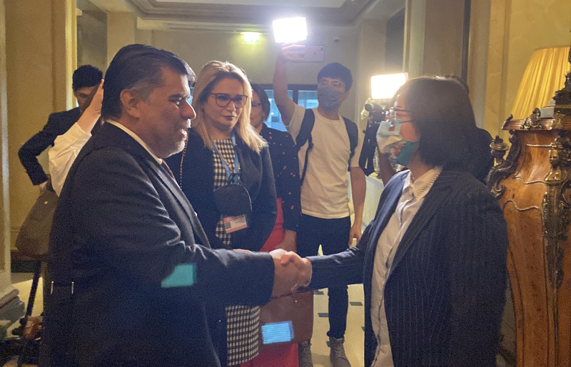 衛生福利部次長李麗芬在日內瓦期間會見友邦巴拉圭衛生部長波帕(Julio Borba),並感謝該國作為會議中首位挺台的邦交國家。李麗芬表示,行動團正盡量爭取與更多的友邦和盟友會面。(圖/中央社)