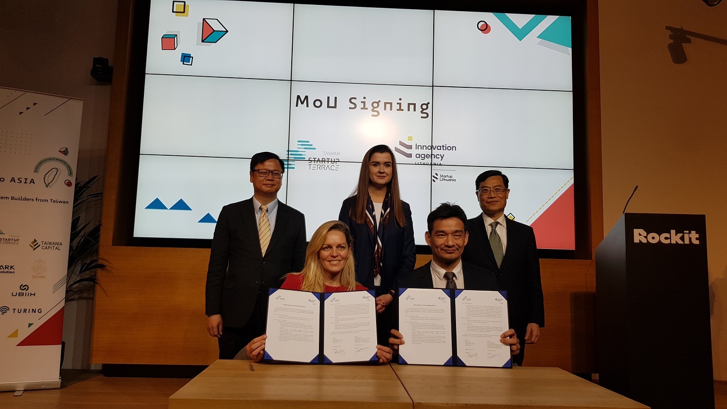 林口新創園和立陶宛國家級新創平台Public Institution Innovation Agency)在活動中簽署MOU,奠定雙方新創合作交流的基石,由陳正祺、駐立陶宛台灣代表處大使黃鈞耀、立陶宛經濟創新部次長Eglė Markevičiūtė共同見證。