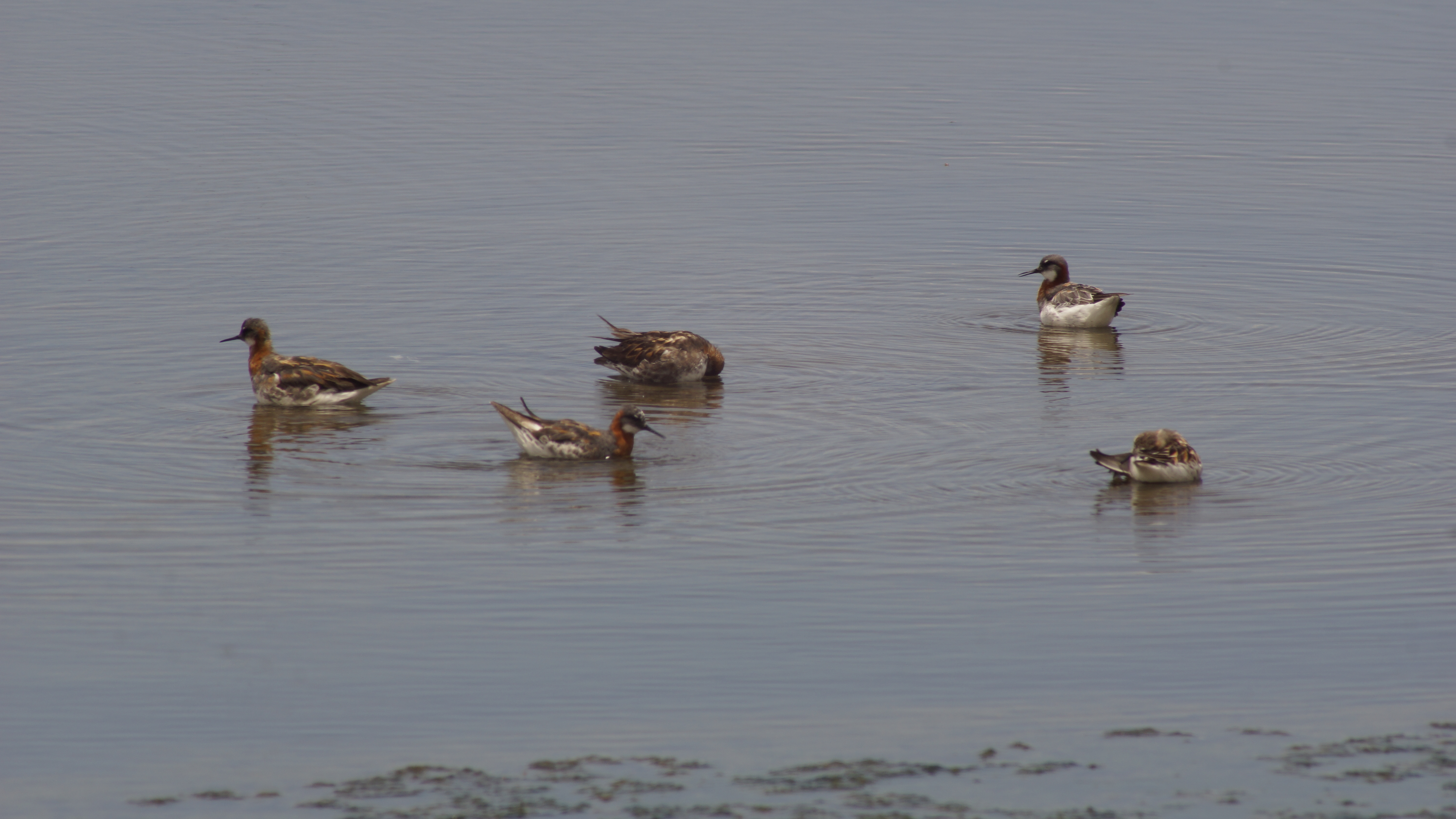 紅領瓣足鷸,身長約16-20cm,台灣普遍的過境鳥,春秋過境期魚塭、池塘、水田可以看到,會在水面上原地打轉,頭朝漣漪圓心啄食,前幾天甚至不太怕人可以近距離觀察,牠們分布於太平洋、北極海與阿拉伯海沿岸,以及西非沿海地區。繁殖羽是白喉,頸上紅色斑塊和灰色身體,翅膀上有淡黃褐色斑紋。與大多數鳥類不同,雌鳥比雄鳥顏色更亮麗。非繁殖期成鳥不那麼多彩:體上灰色,體下白色,背部有條紋,黑色耳羽。