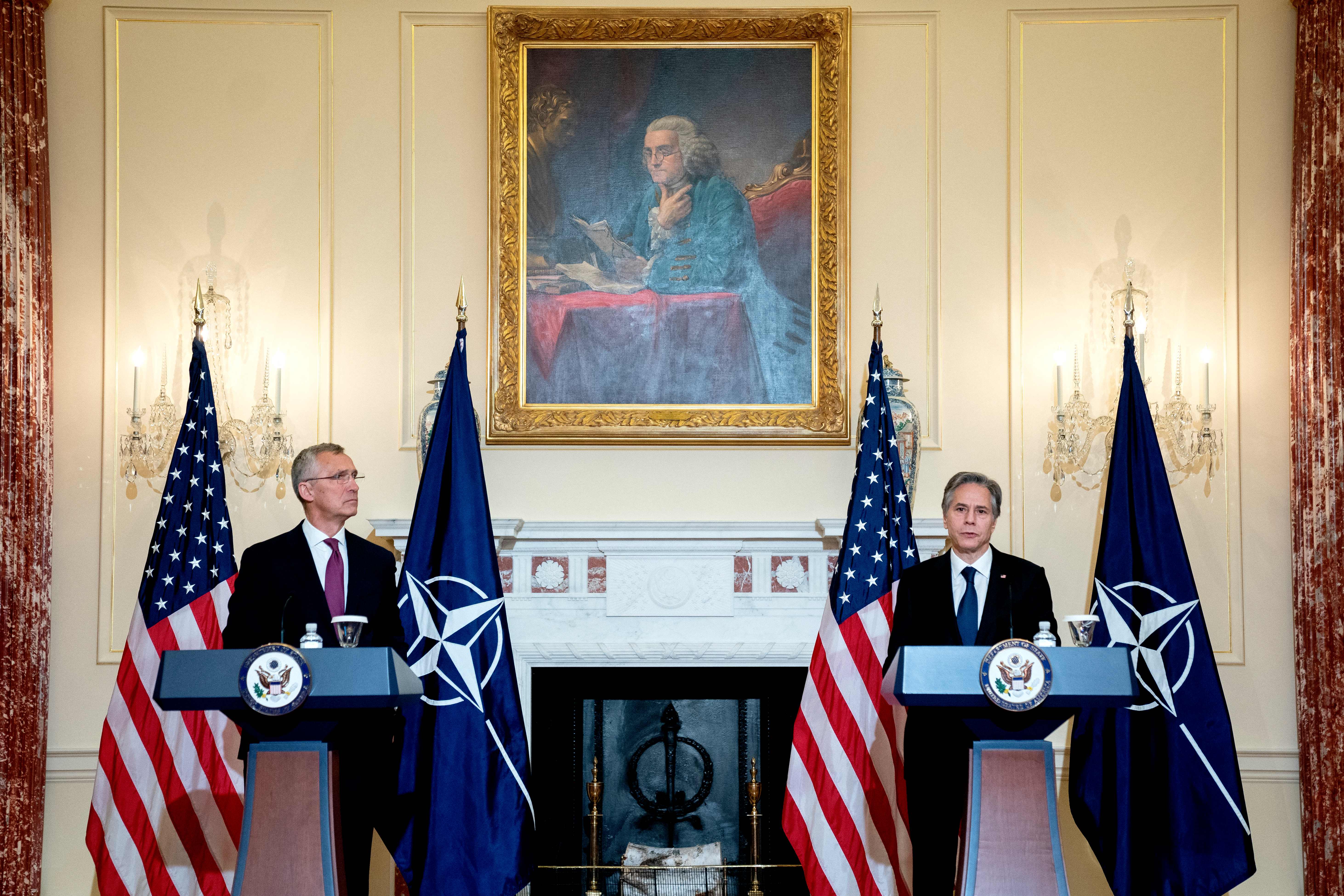 北約秘書長史托騰柏格(左)1日在與美國國務卿布林肯(右)的聯合新聞發布會上表示,將舉行土耳其、芬蘭和瑞典的會談,希望安卡拉不再反對讓芬、瑞兩國在本月峰會前加入北約。(圖/GettyImages)