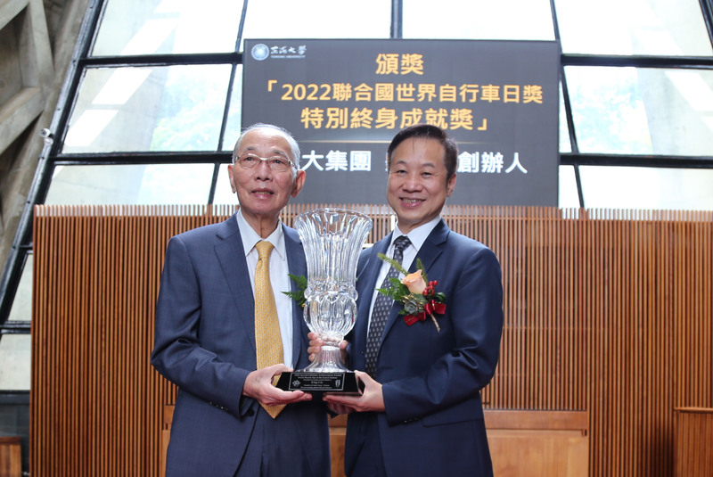 巨大集團創辦人劉金標(左)2日獲頒「2022年度聯合國世界自行車日獎–特別終身成就獎」,由東海大學校長張國恩(右)代為頒發獎座。 (圖/東海大學提供)