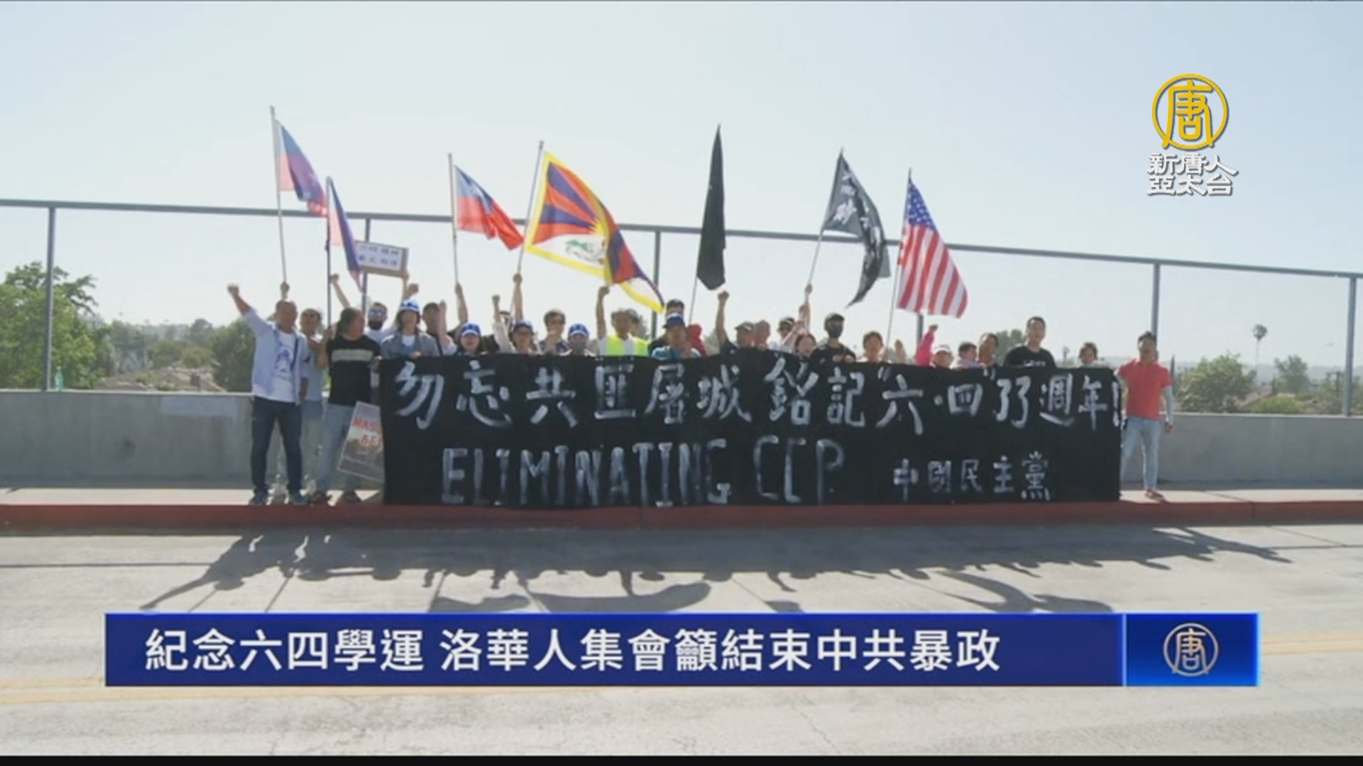 洛杉磯部分華人,於週三(6月1日),在阿罕布拉市10號高速公路的天橋上,舉辦活動,紀念六四運動33週年。看見巨大的六四紀念橫幅,往來車輛紛紛鳴笛支持。