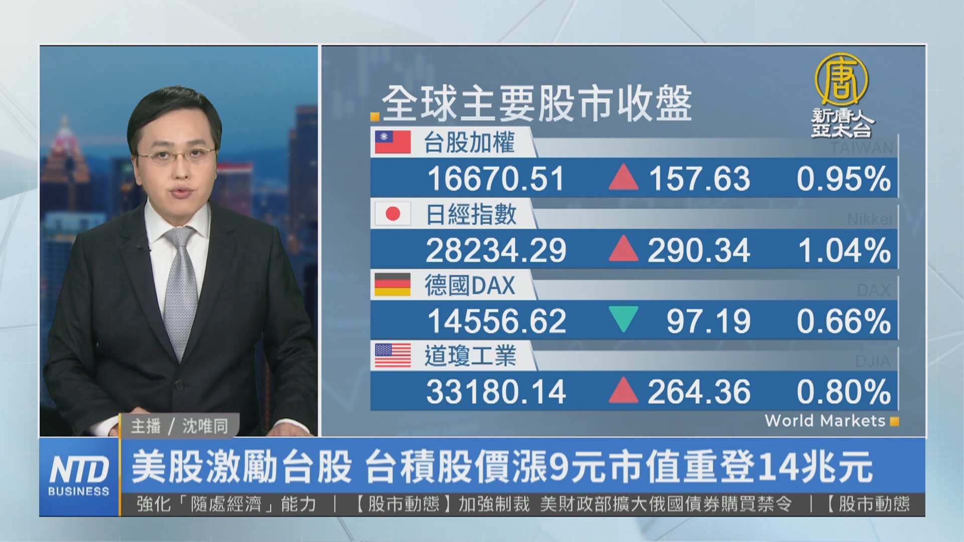 【新唐人亞太台 2022 年 06 月 08 日訊】新聞一開始,首先帶您關心國際股市。受到蘋果、微軟等科技股回升,美股四大指數開低走高,漲約1%。激勵台股今天(8日)同步強彈。在超級股東會的帶領下,半導體雙雄台積電、聯發科領軍,電子權值股反攻。台積電股價收在544元,市值重登新台幣14兆元。台塑四寶、貨櫃雙雄等傳產權值股穩盤助攻。金融股表現也不俗,指數終場上漲 157.63 點,收16670.51點,站回五日線。