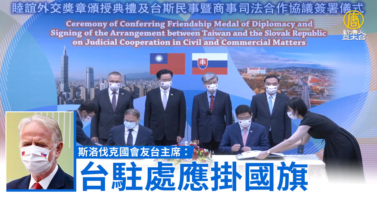 2022-06-08 13:11:22再來看到,台灣和斯洛伐克,去年8月完成簽署「刑事司法合作協議」後,今天上午(8日),斯洛伐克訪問團,也在司法院副院長和法務部長的見證下,完成簽署台斯「民事暨商事司法合作協議」,展現兩國情誼。另外,外交部長吳釗燮也頒贈「睦誼外交獎章」給斯洛伐克國會友台小組主席歐舒斯基(Peter Osusky),表彰其致力拓展台斯關係。