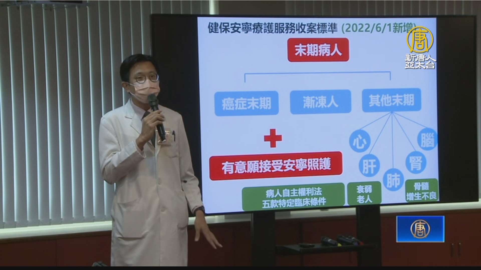 【新唐人亞太台 2022 年 06 月 10 日訊】不只癌末病人可以臨終安寧照護,今年6月進一步放寬健保給付對象,讓更多末期患者可以得到安寧照顧,台中榮總家醫科醫療團隊,協助69歲林女士肝硬化末期患者,進行3年居家安寧,直到善終。