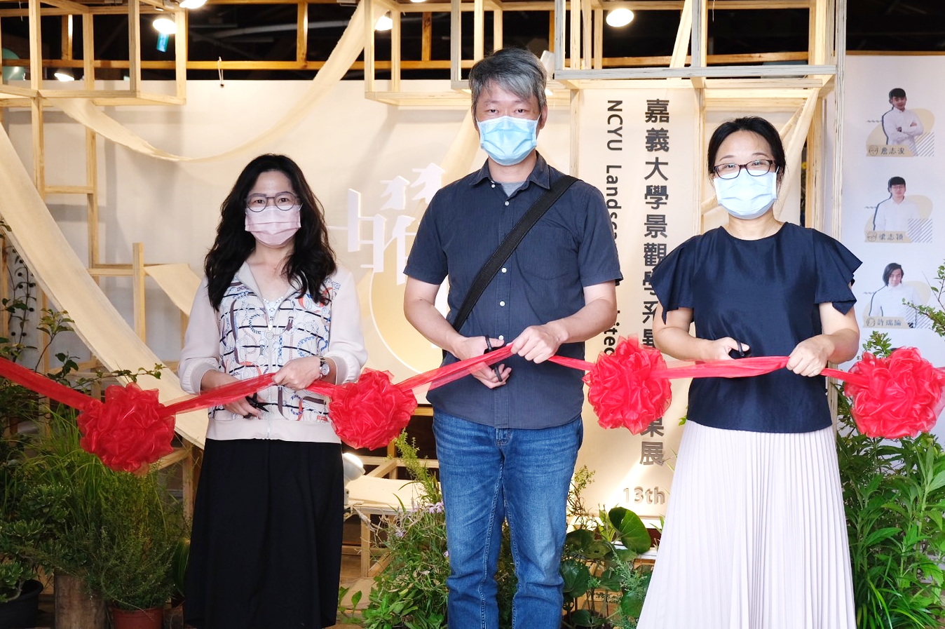 嘉大景觀學系畢業展由陳佩君老師(左)、陳世岸老師(中)及曾碩文老師(右)為活動開幕剪綵。(嘉大提供)