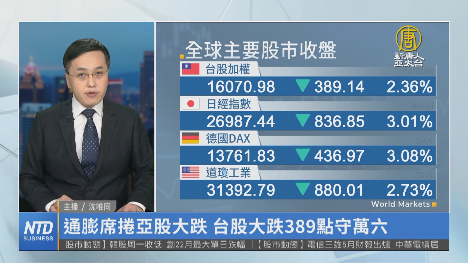 【新唐人亞太台 2022 年 06 月 13 日訊】新聞一開始帶您看到,受到美國上週五公布5月CPI創下新高,美股四大指數收黑,周一亞洲股市方面,日股重挫超過800點,港股韓股也都下跌超過2%,台灣方面,新台幣匯率走弱,電子、金融、傳產全數走跌,盤中一度大跌超過400 點,一舉摜破月線關卡,收盤下跌389.14點,守住萬六。分析指出,全球面臨高通膨利空籠罩,美股弱勢也衝擊台股表現,週四台灣中央銀行升息機率高,也可能使台股進一步陷入修正。
