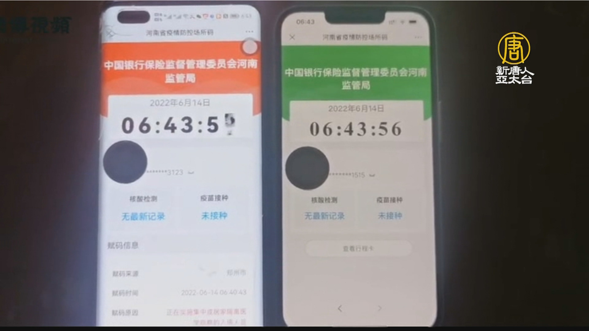 【新唐人亞太台 2022 年 06 月 15 日訊】中國iPhone生產重鎮,河南鄭州地區,日前發生當局利用防疫健康碼阻止抗議的事件。數百名銀行存款客戶原本計劃週一(6月13日)在鄭州抗議,但卻發現他們的健康碼由綠碼被變成紅碼,從而無法參加抗議。這些民眾發現,明明沒確診但一覺醒來後防疫健康碼變成紅色,隨後才恍然大悟,跟病毒或染疫無關,因他們的身分是向銀行討回存款的維權儲戶。