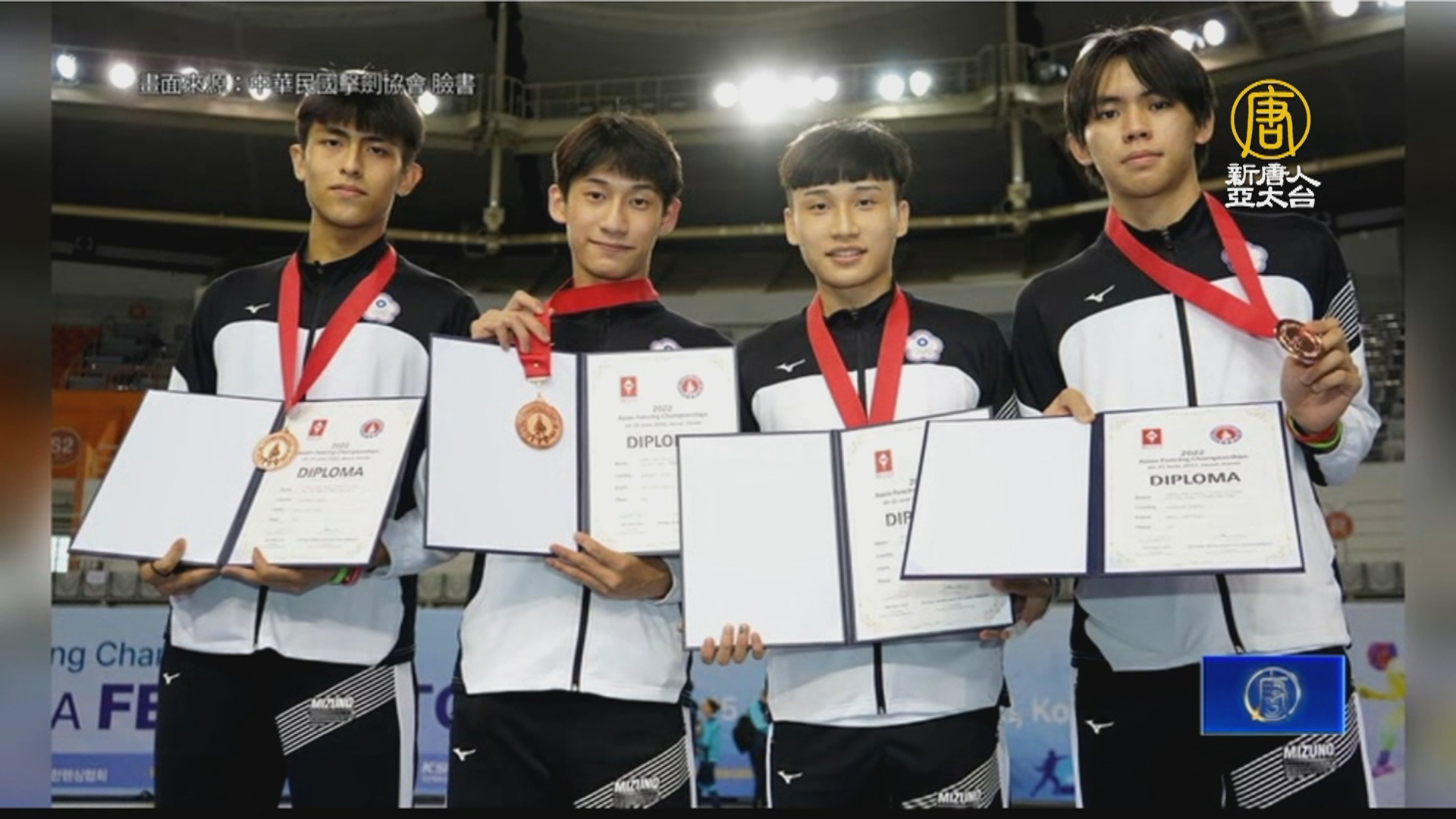 【新唐人亞太台 2022 年 06 月 16 日訊】體壇好消息,由青奧銀牌得主陳弈通領軍的台灣鈍劍男子代表隊,昨天(16日)在韓國舉辦的亞洲擊劍錦標賽,先在8強賽先以45比40淘汰中國對手,但在4強賽,以26比45,不敵日本,最後和香港並列銅牌。這是隊史在亞錦賽的首面男子團體獎牌。台灣擊劍上一次在亞錦賽奪牌,已是12年前女子銳劍團體賽。