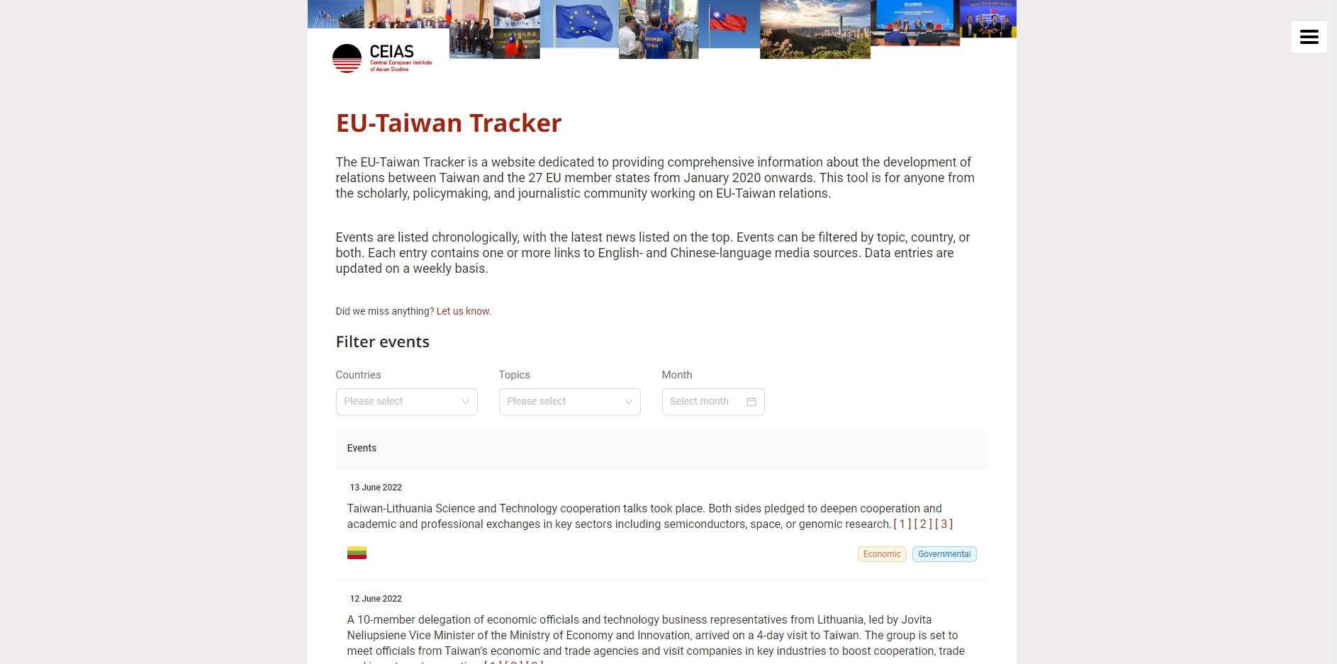 中歐亞洲研究中心5月初更正式啟動「歐盟-台灣追蹤網站」(EU-Taiwan Tracker),紀錄2020年以來台歐關係的重要事件。