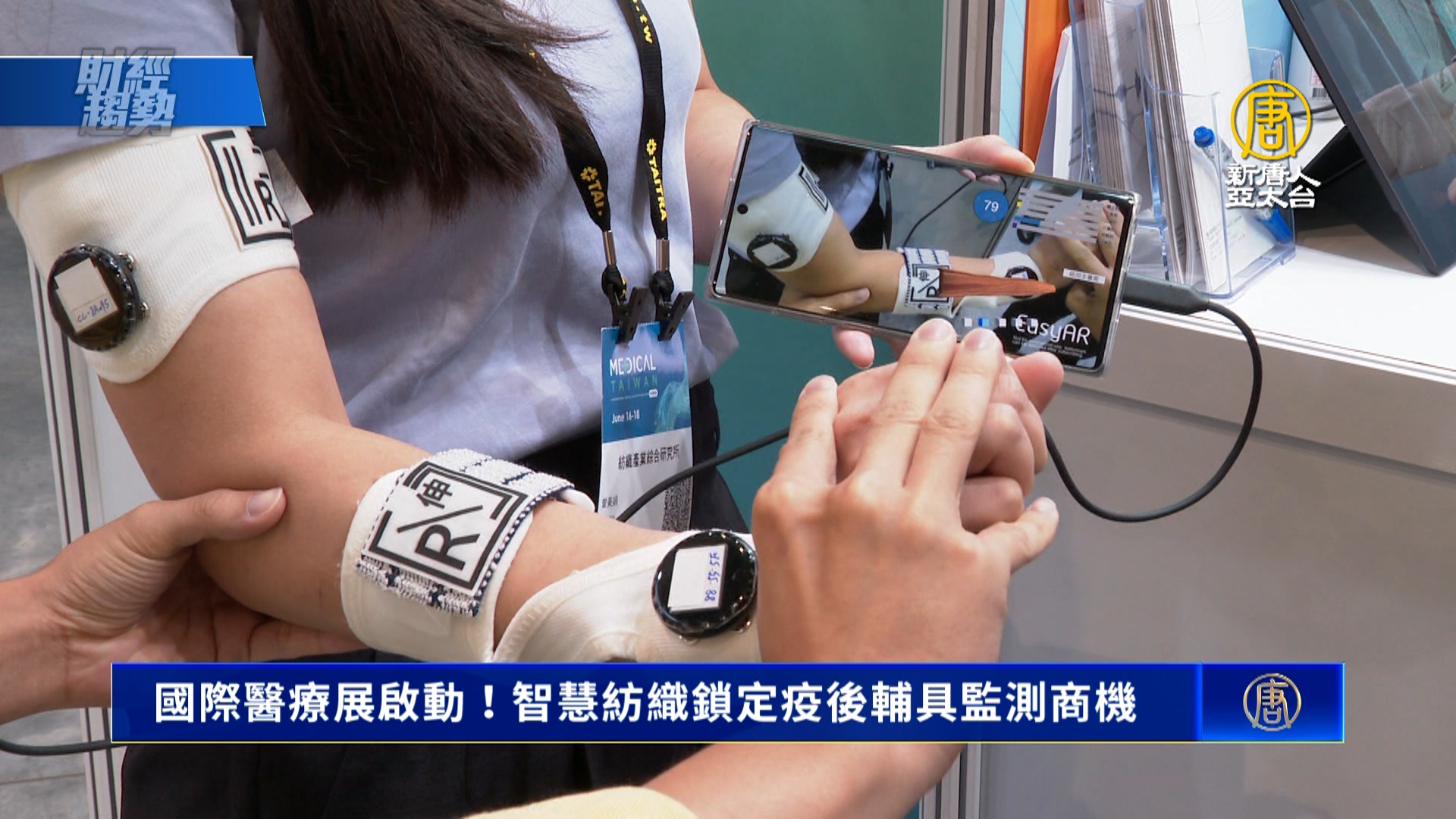 【新唐人亞太台 2022 年 06 月 18 日訊】歡迎回來。台灣國際醫療展本週登場,今年聚焦6大主題,探討疫情下的生活新日常。疫情帶動遠距醫療需求,紡織業者朝智慧紡織發展。跨界整合,鎖定疫後輔具監測商機。