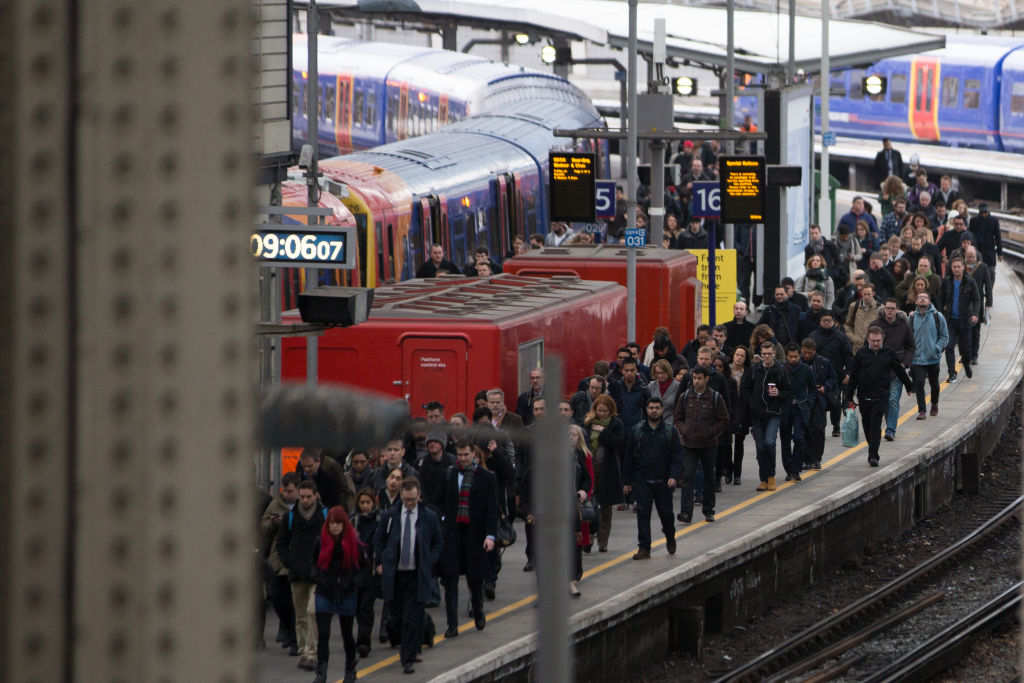 在通膨高漲,勞資雙方無法就薪資達成共識情況下,英鐵路網本週將面臨30年來最大規模罷工。圖為2017年英南方鐵路罷工導致首都運輸中斷,通勤者抵達倫敦滑鐵盧車站資料照。(圖/GettyImages)