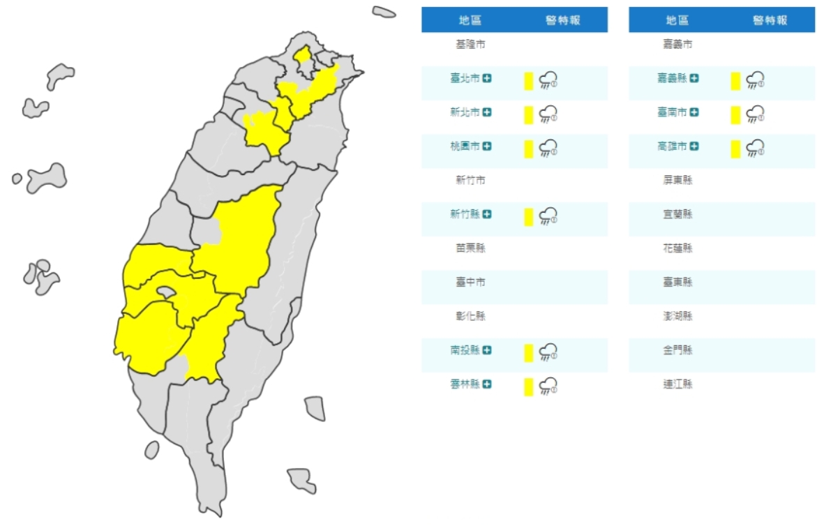 9個大雨特報縣市,包括:台北市、新北市、桃園市、新竹縣、南投縣、雲林縣、嘉義縣、台南市、高雄市。