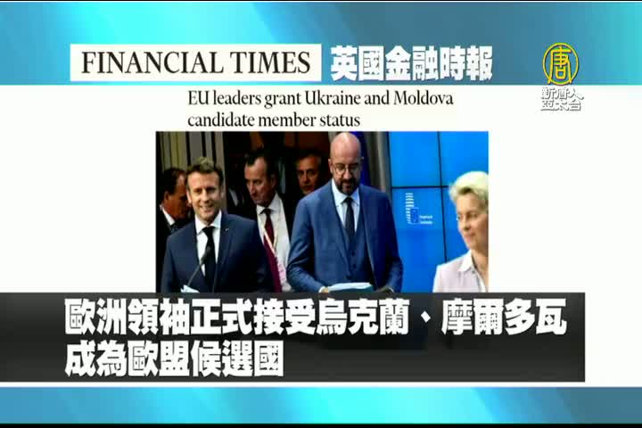 【新唐人亞太台 2022 年 06 月 24 日訊】接著是英國金融時報的報導:歐洲領袖正式接受烏克蘭、摩爾多瓦成為歐盟候選國,烏國總統澤倫斯基形容這是與歐盟關係「歷史性的一刻」。