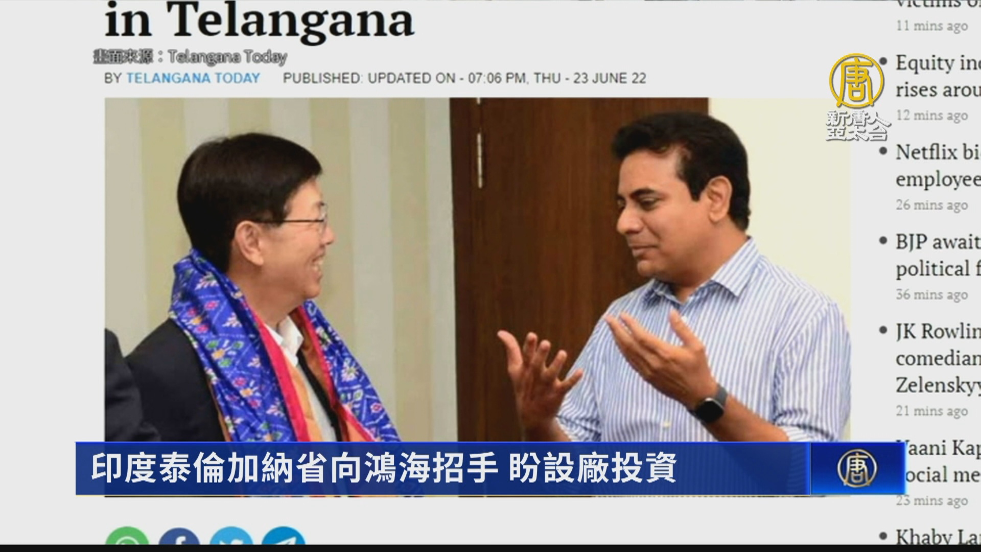 【新唐人亞太台 2022 年 06 月 24 日訊】繼續看到鴻海董事長劉揚偉印度訪問之行。在獲得印度總理莫迪親自接見之後,印度媒體報導,印度南部的泰倫加納省 工業廳廳長納馬爾,23日拜會劉揚偉,邀請鴻海前往設廠。納馬爾表示,對於鴻海準備布局電動車領域感到興奮,承諾會提供最大的支持。對此,劉揚偉表示,印度是具吸引力的生產據點,鴻海將探索泰倫加納省提供的機會。